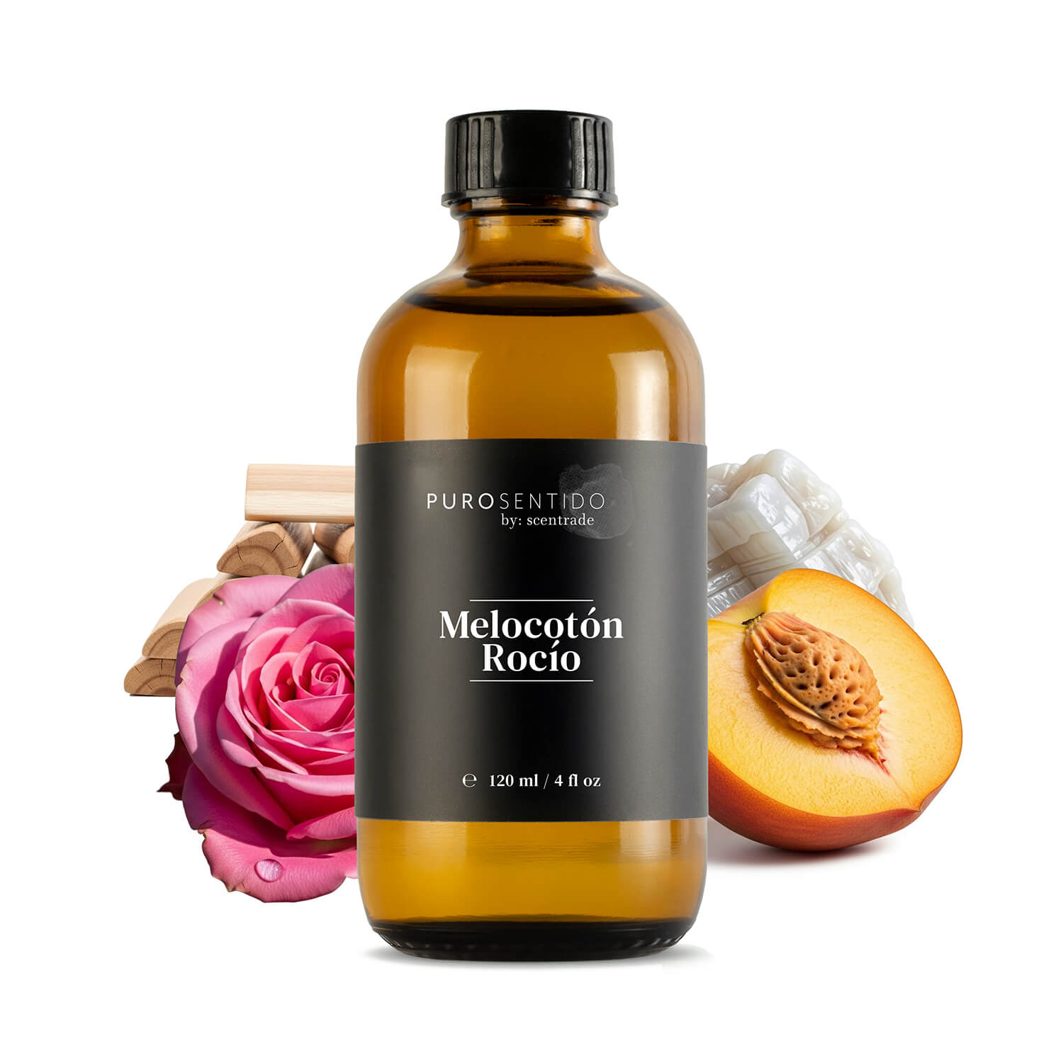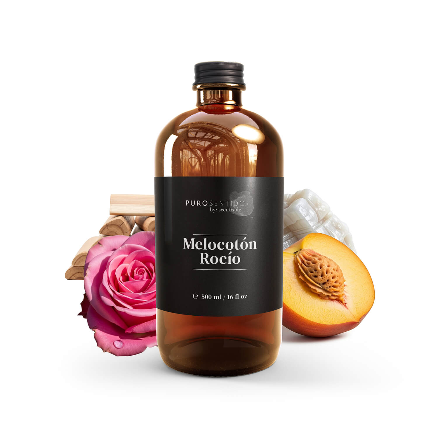 MELOCOTÓN es una fragancia frutal y floral de carácter fresco y delicado. La jugosidad del melocotón abre la composición con una sensación luminosa y refrescante. En el corazón, la flor de melocotón y la rosa aportan suavidad y elegancia, mientras el fondo de almizcle y sándalo envuelve el ambiente con una base limpia, cálida y equilibrada.