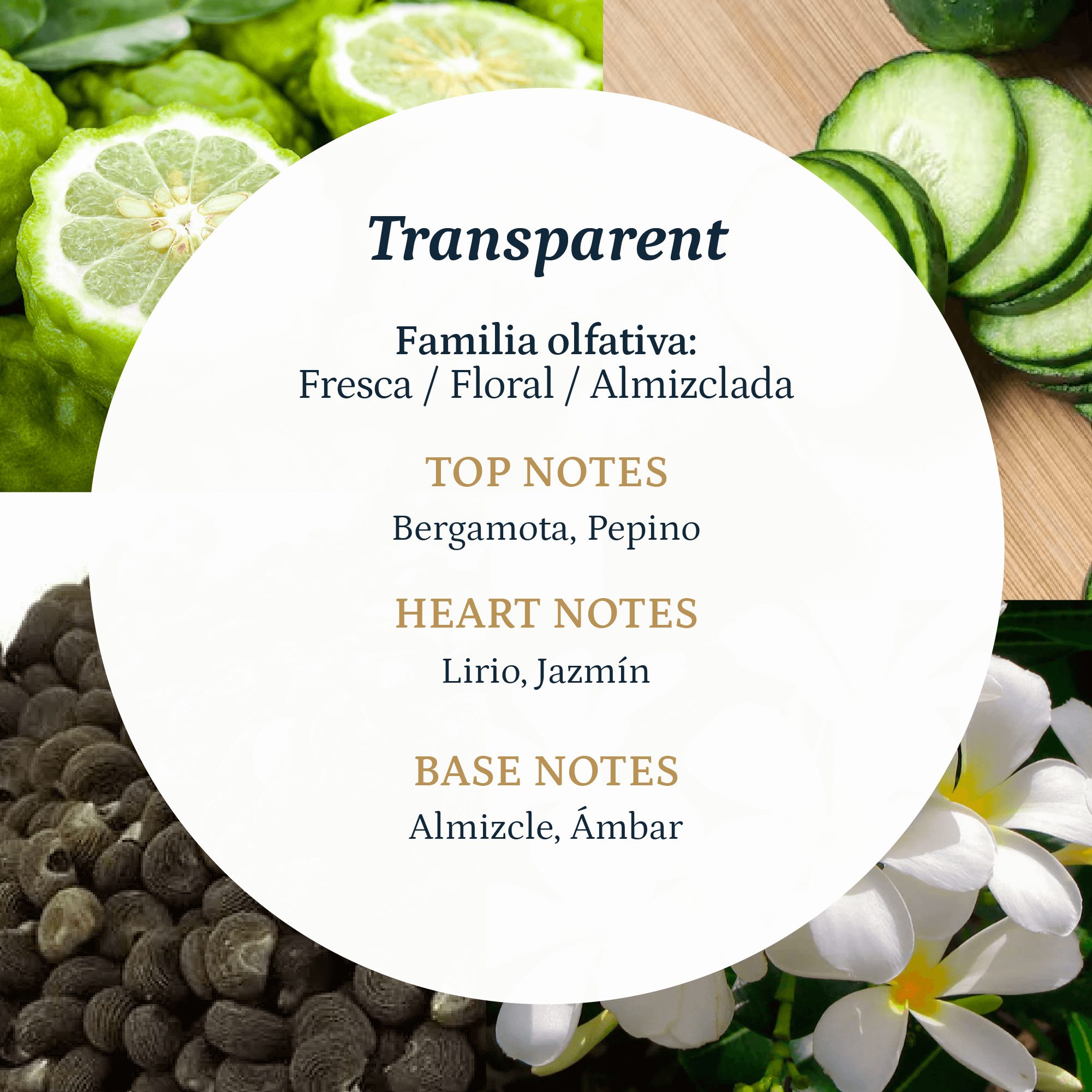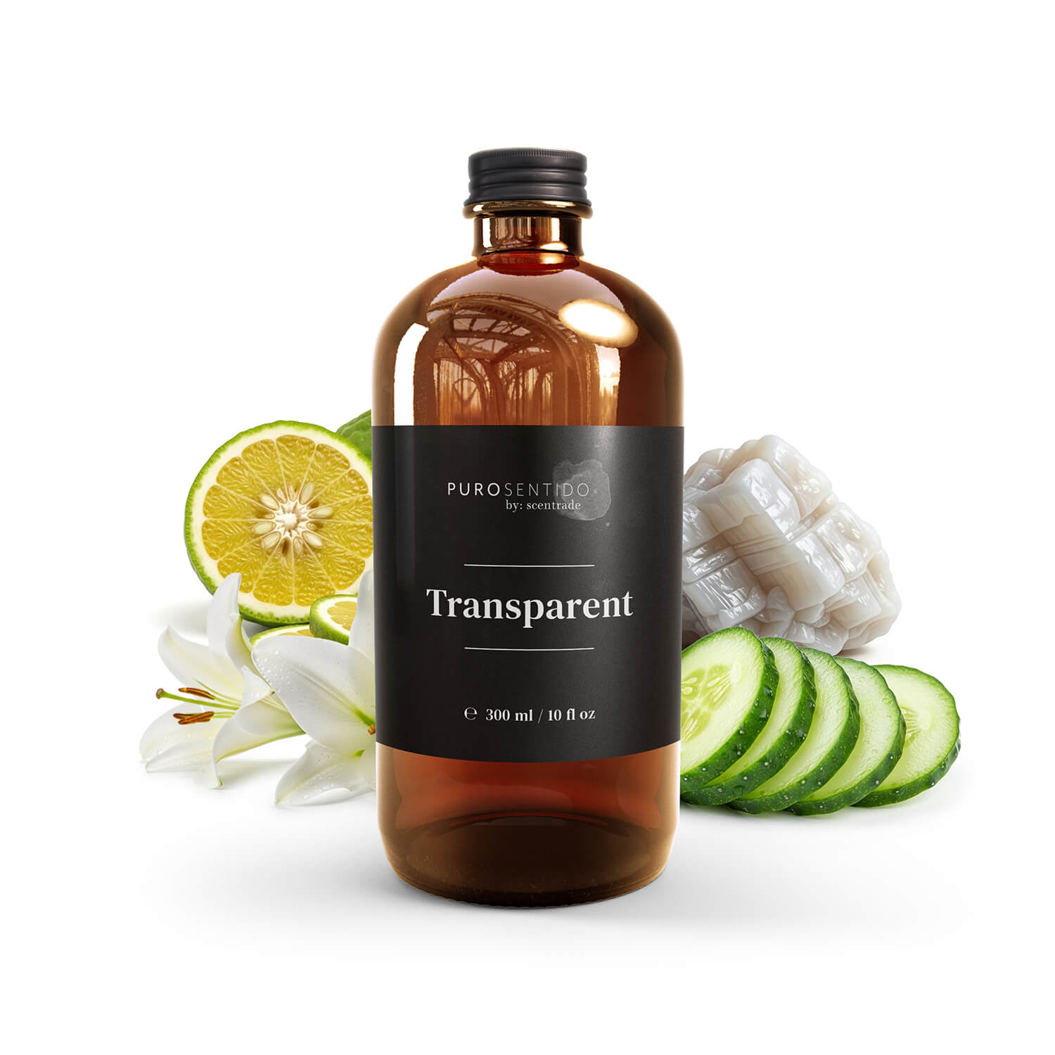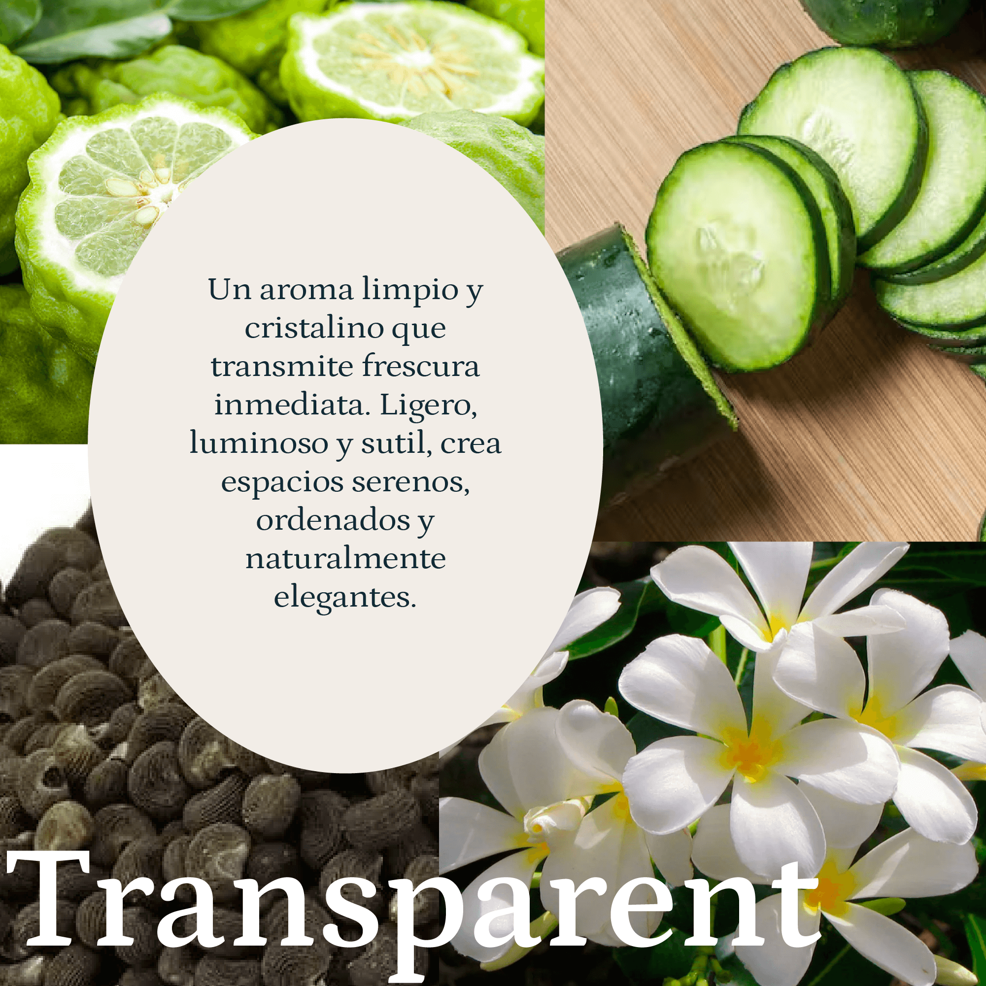 TRANSPARENT es una fragancia fresca y floral de carácter limpio y minimalista. La bergamota y el pepino aportan una salida ligera y refrescante, que evoluciona hacia un corazón floral suave de jazmín y lirio. El fondo de almizcle y ámbar envuelve el espacio con una sensación pura, equilibrada y duradera.